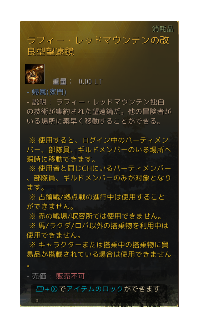 ラフィー・レッドマウンテンの改良型望遠鏡は、ほかの冒険者のところに自分が飛ぶことが出来るようになります。